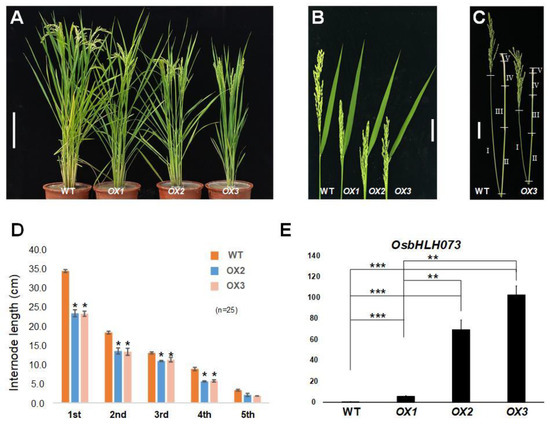 At the reproductive stage, osbhlh073-D plants showed the defective panicle exsertion phenotype besides a semi-dwarf compared to wild-type (Figure 1C,D). The poor panicle exsertion was mostly caused by inhibition of the elongation of the first and second internodes, resulting in the failure of the panicles of osbhlh073-D to fully emerge from the leaf sheath (Figure 1E,F). To confirm mutant phenotypes, we generated OsbHLH073-overexpressing (OX) plants constitutively expressing OsbHLH073 under the control of the maize ubiquitin promoter via Agrobacterium-mediated transformation in a Dongjin rice background [50]. We selected three lines among 6 T0 plants. Those selected lines were used for the generation of T2 homozygous lines and all displayed the similar phenotype to the osbhlh073-D mutant (Figure 2A–D). We also confirmed that the mRNA level of OsbHLH073 in the T2 OX plants (OX1- OX3) was correlated to the semi-dwarf phenotype (Figure 2A,E). This result indicates that OsbHLH073 regulates internode elongation in a negative way.