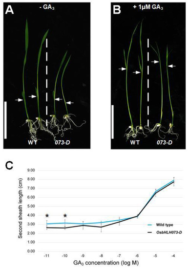 Rescue of the osbhlh073-D semi-dwarf phenotype by exogenous gibberellic acid (GA3) application. (A) Phenotype of seven-day-old plants in the light without GA3. Arrow indicates the second leaf sheath. (B) Phenotype of seven-day-old plants in the light with 1 µM of GA3 added to the medium. Bar = 5 cm. Arrow indicates the second leaf sheath. (C) Measurement of second leaf sheath length after GA3 treatment. Data are mean ± SD from at least 10 plants. (* p < 0.05, Student’s t test).