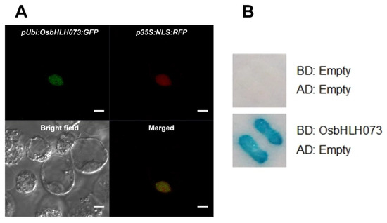 Most of the bHLH proteins are TFs. Some bHLH TFs, such as AtbHLH112 [57] and OsBC1, are activators [41], whereas some others, such as JA-ASSOCIATED MYC2-LIKE2 (JAM2) and JAM3 [58], are repressors. To investigate the function of OsbHLH073, we constructed the OsbHLH073-GFP fusion construct under the maize ubiquitin1 promoter and transfected it into a rice protoplast. To control the localization in the nucleus, 35S::NLS-mRFP vector was transfected into the rice protoplast. As expected, NLS-mRFP was localized in the nucleus and the OsbHLH073-GFP fusion protein was also detected in the nucleus (Figure 6A). We then examined the transcriptional activity of OsbHLH073 using the yeast two-hybrid system [41]. As shown in Figure 6B, OsbHLH073 showed transcriptional activation activity in yeast, even though it was not likely to contain a DNA-binding region.