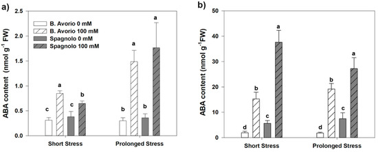 Levels of abscisic acid (ABA) in (a) roots and (b) leaves of “Bianco Avorio” and “Spagnolo” C. cardunculus var altilis genotypes after 2 and 21 days of 0 (control) and 100 mM (salinity treatment) NaCl. Each value represents the mean ± SD of three biological replicates. Values indicated with different letters are significantly different between genotypes and treatments within the same sampling time at p < 0.05, by analysis of variance (ANOVA).