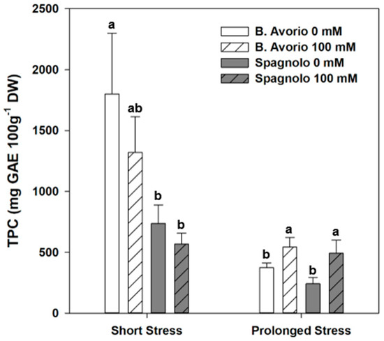 Total phenolics content (TPC) in leaves of “Bianco Avorio” and “Spagnolo” genotypes of C. cardunculus var altilis after 2 and 21 days of 0 (control) and 100 mM (salinity treatment) NaCl, expressed as gallic acid equivalents (GAE) and measured by the ABTS assay. Each value represents the mean ± SD of three biological replicates. Values indicated with different letters are significantly different between genotypes and treatments within the same sampling time at p < 0.05, by analysis of variance (ANOVA).