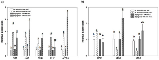 Effects of salt stress on relative expression of phenylpropanoids and sesquiterpenes key biosynthetic genes measured upon prolonged (21 days) stress treatment (100 mM NaCl) in leaves of “Bianco Avorio” and “Spagnolo” genotypes of C. cardunculus var altilis. (a) qRT- PCR analysis of HCT, HQT, FNSII, F3′H and MYB12 TF; (b) qRT-PCR analysis of GAS, GAO and COS. Results are expressed as fold changes relatively to the relevant unstressed control (21 days, 0 mM NaCl) of each genotype. Each value represents the mean ± SD of three biological and 2 technical replicates. Values indicated with different letters are significantly different between genotypes and treatments at p < 0.05, by analysis of variance (ANOVA).