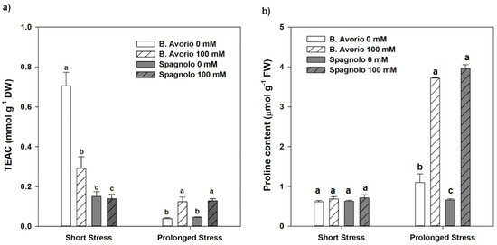 (a) Antioxidant activity, measured by ABTS assay and expressed as Trolox equivalent antioxidant capacity (TEAC), and (b) proline content in leaves of “Bianco Avorio” and “Spagnolo” genotypes of C. cardunculus var altilis after 2 and 21 days of 0 (control) and 100 mM (salinity treatment) NaCl. Each value represents the mean ± SD of three biological replicates. Values indicated with different letters are significantly different between genotypes and treatments within the same sampling time at p < 0.05, by analysis of variance (ANOVA).