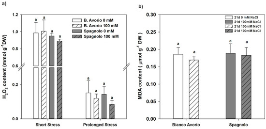 (a) H2O2 content measured in leaves of “Bianco Avorio” and “Spagnolo” genotypes of C. cardunculus var altilis after 2 and 21 days of 0 (control) and 100 mM (salinity treatment) NaCl; (b) MDA content in leaves “Bianco Avorio” and “Spagnolo” genotypes of C. cardunculus var altilis measured upon prolonged salt stress. Each value represents the mean ± SD of three biological replicates. Values indicated with different letters are significantly different between genotypes and treatments within the same sampling time at p < 0.05, by analysis of variance (ANOVA).