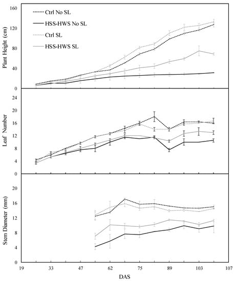 At the end of the experiment, plant height was reduced by 47% and 76% under HSS-HWS SL and HSS-HWS No SL compared to the averaged Ctrl SL and No SL, respectively. Leaf number decreased by 30% and 23% under HSS-HWS SL and HSS-HWS No SL, respectively. Stem diameter decreased by 35% and 20% under HSS-HWS SL and HSS-HWS No SL, respectively.