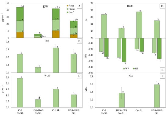 (A) Dry weight (DW); (B) root-to-shoot ratio (R:S); (C) water use efficiency (WUE); (D) relative water content (RWC); (E) water and osmotic potential (WP and OP, respectively); and (F) osmotic adjustment (OA) in the four treatments. Ctrl, control; HSS-HWS, high soil salinity and high water salinity; SL, salt leaching. Vertical bars indicate ± standard error (n = 3). Different letters indicate significant differences at p ≤ 0.05. In Figure 1A (DW), lowercase and uppercase letters indicate statistical differences (p ≤ 0.05) among treatments in single organs and their totals, respectively.
