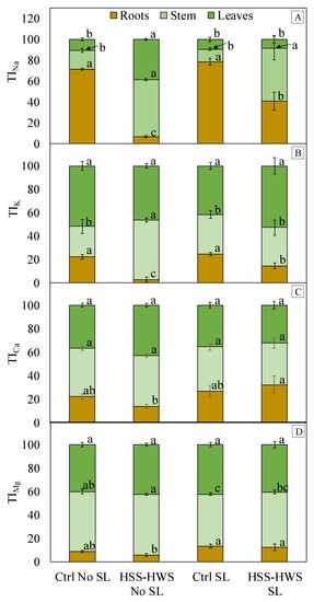 Translocation Index (TI) of (A) sodium, (B) potassium, (C) calcium, and (D) magnesium to the roots, stem, and leaves. Ctrl, control; HSS-HWS, high soil salinity and high water salinity; SL, salt leaching. Vertical bars indicate ± standard error (n = 3). Different letters indicate significant differences among treatments at p ≤ 0.05.