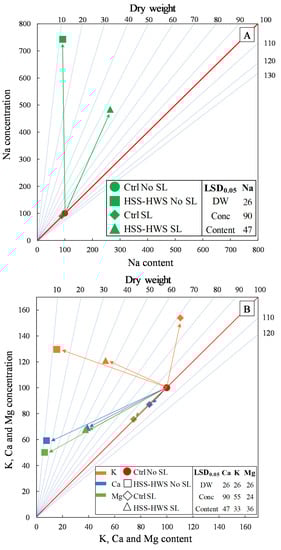 (A) Vector analysis showing directional changes in biomass and Na content and concentration in sorghum plants and, (B) vector analysis showing directional changes in relative biomass and K, Ca, and Mg content and concentration in sorghum plants. Dry weight and element content and concentration are expressed as relative data with respect to the Ctrl No SL treatment, which is set at 100% and is indicated by a red filled circle.