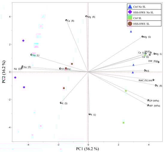 PC2 separated SL from No SL treatments, although the separation was imperfect. The parameters that accounted for PC2 are Ca(R) and Mg(R), which had high positive loadings. This is consistent with the ANOVA of Ca and Mg translocation indices (TI) to the roots, which were higher in HSS-HWS SL than in HSS-HWS No SL (Figure 3C,D). The analysis also identified K(L) and K(S) as important components of PC2, with high negative loadings on PC2. Potassium concentration (Table 2) and translocation (Figure 3) to the leaves were not statistically different between HSS-HWS SL and No SL. Notably, K concentration and translocation to the roots decreased significantly under HSS-HWS SL and, to a greater extent, under No SL. Potassium translocation to the stem increased significantly only in HSS-HWS No SL, although K concentration resulted as comparable with the other three treatments. This circumstance and the weak loadings of K(S) and K(L) on the PC1 (salinity) suggest that salinity mainly alters K homeostasis at the root level, whereas K status in the stem and leaves depends more on SL.