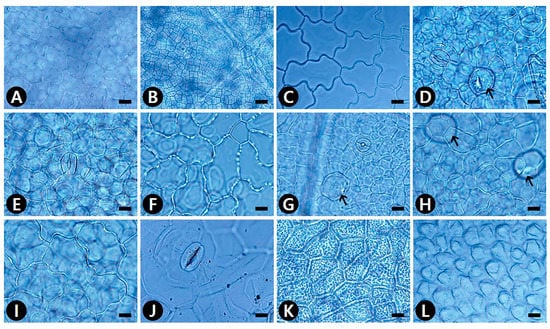 Light microscopy (LM) micrographs of adaxial (AD) leaf surfaces in Korean Piperales. (A) Aristolochia contorta, straight to curved anticlinal walls (ACW). (B) A. manshuriensis, straight ACW. (C) Asarum heterotropoides var. mandshuricum, undulous ACW. (D) A. heterotropoides var. seoulense, ano with idioblast (black arrow). (E) A. koreanum, sta. (F) A. maculatum, undulous ACW, striate, and wrinkled fine relief (FR). (G,H) A. misandrum, ano with idioblast (black arrow). (I) A. versicolor, straight to curved ACW. (J) Houttuynia cordata, sta. (K) Piper kadsura, straight ACW, tuberculate FR, and thick cell walls. (L) Saururus chinensis, straight ACW, conical periclinal cell wall (PCW). ano, anomocytic stomata; sta, staurocytic stomata. Scale bars = 20 μm.