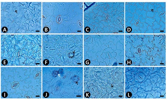 All quantitative data of epidermal cells and stomata complex obtained from LM and SEM images were determined from the Digimizer software (Digimizer version 5.4.3, MedCalc Software, Mariakerke, Belgium). The SI value was calculated as described by Salisbury []: SI = S/E + S × 100, where SI = Stomatal index, S = Number of stomata per unit area (mm2), and E = Number of epidermal cells per unit area (mm2). The PCI value was calculated as described by Holland and Richardson []: PCI = (SCL)2 × SD × 10−4.