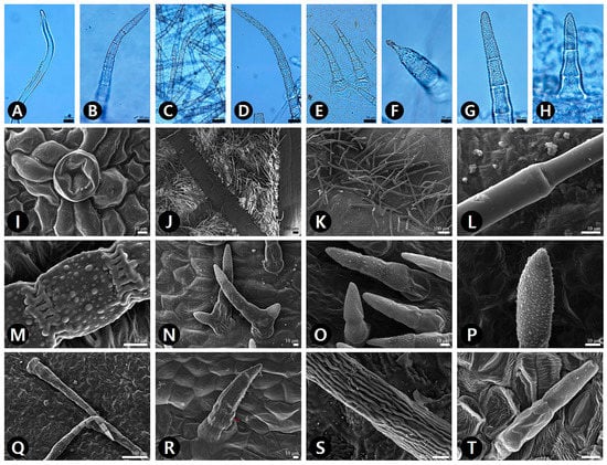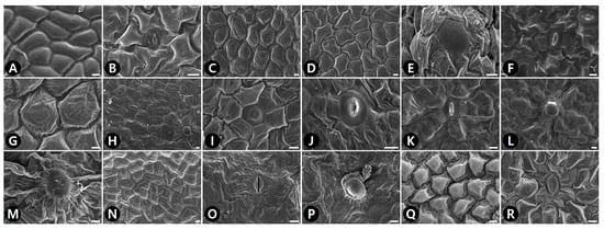 Although leaf micromorphology has received less attention than other reproductive characteristics (e.g., floral, fruits, and seeds) as a taxonomically informative characteristic, it has been demonstrated that epidermal cells, stomatal complex [,,,,], trichomes [,,,,], and epicuticular waxes [,,,] in the epidermal surface of the leaves are useful diagnostic and taxonomic characteristics.