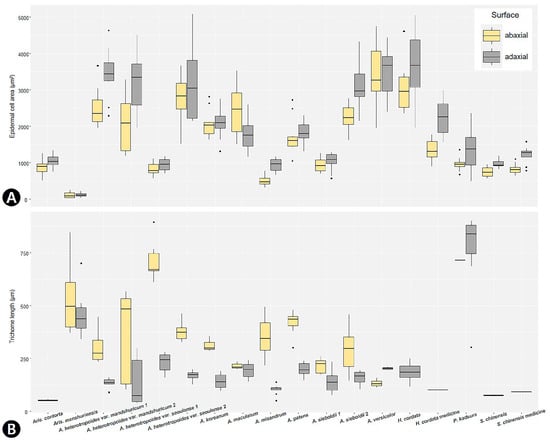 The size of epidermal characteristics with epidermal cells and trichomes in Korean Piperales. Grouped boxplots show the median, 25th and 75th percentiles (box), 10th and 90th percentiles (whiskers), and outliers (closed circle). (A) Actual epidermal cell area (μm2). (B) Trichome length (μm2).