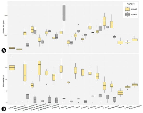 The quantitative data of stomatal characteristics with the stomatal area and stomatal index in Korean Piperales. Grouped boxplots show the median, 25th and 75th percentiles (box), 10th and 90th percentiles (whiskers), and outliers (closed circle). (A) Actual stomatal complex area (μm2). (B) Stomatal index (%).