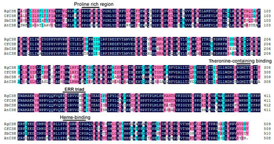 Alignment of the deduced RgC3H protein sequence with those of related C3Hs. Dark blue shading indicates amino acid identities, red and light blue shading indicates amino acids with differences in similarity. The locations of the putative conserved proline-rich region, heme-binding, threonine-containing binding pocket, and ERR triad motifs are shown above the sequences.