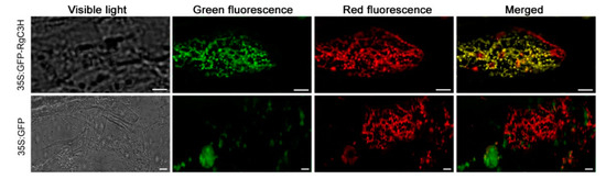 Based on in silico localization analysis using the PSORT and Plant-mPLoc programs, RgC3H was predicted to be consistently located in the endoplasmic reticulum (ER) (Table S1). To experimentally determine the subcellular localization of RgC3H, the complete coding region of the gene was fused to the N-terminus of GFP (Figure S3). The CaMV35S:GFP-RgC3H construct was transiently expressed in onion epidermis. While both the green fluorescence from fusion protein of CaMV35S:GFP-RgC3H and the red fluorescence from ER Marker were detected by fluorescence microscopy, the merged yellow fluorescence from more than five transgenic cells was also observed and all of them had a similar result. One of them was presented here (Figure 3), confirming the in silico prediction of RgC3H ER localization.