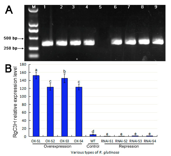 Confirmation of positive RgC3H-transgenic R. glutinosa. (A) PCR products for the positive screening of transgenic lines; Lanes M and 5 represent the DL2000 size marker and WT plants, respectively; Lanes 1–4 and 6–9 represent RgC3H overexpression and repression lines, respectively; (B) RgC3H expression patterns in these roots. The error bars represent the standard error (n = 3) (p < 0.05); the lowercase letters (a–e) represents different significant signs, the below is same.
