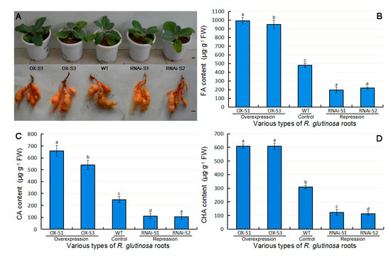 The morphology and accumulation of several phenolic acids in WT and RgC3H-transgenic R. glutinosa roots. (A) Photographs of the morphology of the WT and transgenic lines (bar = 2 cm); (B) FA content; (C) CA content; (D) CHA content. The error bars represent the standard error (n = 3) (p < 0.05).