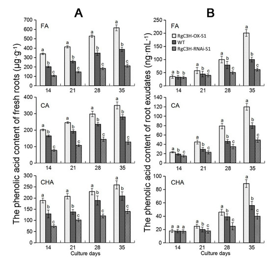 Similarly, in the analysis of the root exudates, we found that the accumulation of these phenolic acids in more than three stages mostly showed the same change tendency in the exudates of the roots of the three types of plants (i.e., RgC3H-OX-S1>WT>RgC3H-RNAi-S1) (Figure 6B). Moreover, following longer culture times (especially 35 days of culture), the change tendency of the accumulation of these phenolic acids became increasingly significant. For example, in the FA accumulation process determined from the various root exudates, the FA contents of the RgC3H-OX-S1 root exudates exhibited an approximately 1.29- or 2.01-fold increase relative to the WT content after culture for 21 or 35 days, respectively, while the FA contents of the root exudates of the RNAi repression line (RgC3H-RNAi-S1) at the corresponding times exhibited an approximately 0.89- or 0.62-fold decrease relative to the WT content, respectively. The results indicated that the overexpression or repression of RgC3H altered the accumulation and release amount of these allelopathic phenolic acids in R. glutinosa roots; moreover, the accumulation of these phenolic acids showed a positive relationship to their release in the roots.