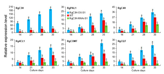 To gain a better understanding of the molecular regulatory mechanism of RgC3H in the phenolic acid/phenylpropanoid pathways, the expression of the RgC3H, RgPAL1, RgC4H, Rg4CL1, RgCOMT, and RgCQT genes was analyzed in the transgenic roots from sterile cultures after 14 to 35 days. Overall, the expression levels of the six genes in RgC3H-OX-S1 roots mainly exhibited a significant increase (1.2–6.0 folds) relative to those in the WT at these corresponding time points (especially after 35 days of culture); while their expression levels in RgC3H-RNAi-S1 roots mainly exhibited a significant decrease (0.7–0.2 fold) relative to those in the WT (Figure 7). For example, after culture for 35 days, RgC3H expression in RgC3H-OX-S1 and RgC3H-RNAi-S1 exhibited an approximately 6.0-fold increase and 0.17-fold decrease, respectively, relative to that in the WT, further confirming the overexpression or repression of RgC3H in these transgenic lines. The expression levels of the other five genes in the RgC3H-overexpressing (RgC3H-OX-S1) or RgC3H-repressioning (RgC3H-RNAi-S1) roots during most of the examined culture stages were significantly higher or lower, respectively, than those in the WT. For example, after culture for 35 days, the levels of RgPAL1, Rg4CL1 and RgCQT expression in RgC3H-OX-S1 roots exhibited approximately 1.55-, 1.74- and 2.36- fold significant increases, respectively, relative to those in the WT; in contrast, their expression levels in RgC3H-RNAi-S1 exhibited an approximately 0.58-, 0.42- and 0.23-fold decreases relative to those in the WT. The results indicated the expression amount of these genes involved in the phenolic acid/phenylpropanoid pathways were consistently altered by the overexpression and repression of RgC3H genes.