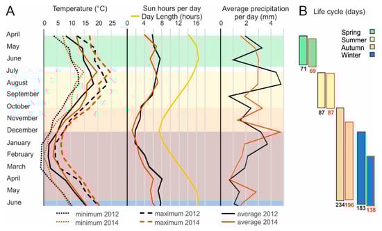 Environmental conditions and their effect on the plant life cycle. (A) The minimum, average and maximum air temperature, sun hours per day (average per month), day length (yellow line) and average precipitation per day during four seasons in 2012 (black lines) and 2014 (red lines) at the location where the plants were grown. (B) The plant life cycle from seed sowing to seed harvest of each experimental season (spring, summer, autumn and winter, in 2012 (black outlines) and 2014 (red outlines)).