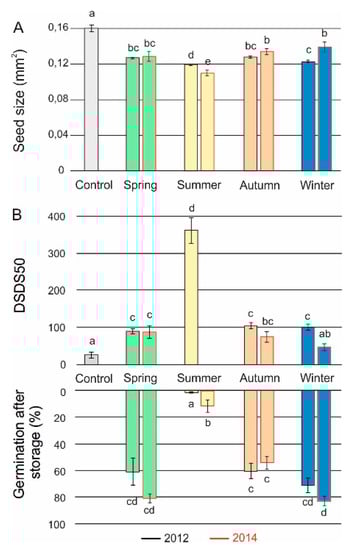 Average seed performance over the different seasons. (A) Average seed size (mm2) and (B) Average of dormancy (DSDS50) and seed germination after storage (longevity) levels of plants grown in different seasons (spring, summer, autumn and winter) in 2012 (black outline) and 2014 (red outline). The grey bars represent the data of the control environment as published by He et al. [6]. Averages of four replicates are displayed. Error bars represent standard error. Means followed by the same letter did not differ by Tukey’s test (P < 0.05).