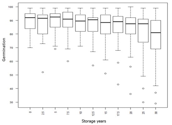 The overall picture of seed germination development over storage time across all accessions (species and cultivars) is illustrated by boxplots (Figure 1). A lower and upper percentile defines the box, in which 75% of the observations were found. A marked line denotes the median germination value, and the whiskers and small circles show observations away from the box. At the initiation of the experiment in 1986 (year 0 = y0), most of the seed lots showed an excellent germination ability. The box-range was from 83% to 95%, and the median was at 92% germination. The overall picture was relatively stable over the first twenty to twenty-five years, but the variation increased over time as some seed lots showed a reduced germination. After 30 years, the median value across all the lots was 80%, but with outlier samples below 40%, and some of the lots in the 50–70% range.