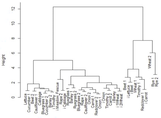 Figure 2 shows a dendrogram of a cluster analysis of the germination results of the accessions. The dissimilarity values of the fusion level values of the dendrogram indicated the cutting level six clusters to be correct. The largest cluster, cluster 1, contained 19 lots. It contained both normal and lots with seed-borne pathogens (i-prefix lots). Also, cluster 2 contained both normal and seed-borne pathogens, as did cluster 6. In cluster 1 we found Barley 1, Ryegrass 1, Ryegrass 2, Timothy 2, Bluegrass 2, Redclover 2, Rape 1, Rape 2, Onion 1, Onion 2, Carrot 1, Carrot 2, Cauliflower 2, i1 Wheat, i2 Wheat, i Barley, i Meadow_fescue, i Onion, and i Cabbage. In cluster two, we found Barley 2, Bluegrass 1, Beet 2, Lettuce, Cabbage, Cucumber 1, Cucumber 2, Cauliflower 1, and i-Timothy. In cluster three, we found Wheat 1, Timothy 1, Redclover 1, and i Carrot. In cluster 4, we found Wheat 2. In cluster 5, we found Rye 1 and Rye 2. In cluster 6, we found Beet 1, i Lettuce, and i Beet. Lots with seed-borne pathogens (i-prefix lots) were spread over the clusters, showing that such pathogens do not explain much of the seed longevity. Furthermore, seed lots of the same species were only partly in the same clusters; for example, the two cucumber (Cucumis sativus L.) lots and the two rye (Secale cereale L.) lots. This also shows that interspecies differences are not of importance for explaining seed longevity.