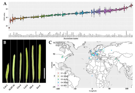 To identify new genes that regulate seed yield in Arabidopsis, we recorded yield relevant phenotypes including silique length, silique number, seed number per silique (SNS), and seed density (SD) in 260 natural accessions of Arabidopsis germplasm with different genetic backgrounds and geographical origins provided by Nottingham Arabidopsis Stock Centre (NASC) [] (Table S1). Our preliminary results revealed that SNS phenotype was worthy further investigations. Thus, to ensure the accuracy of the data, 153 accessions with delayed flowering, poor growth, and reduced plant vegetative organs were removed. In the remaining 107 accessions, only five well-developed siliques were collected from the 6th to 12th siliques in the main inflorescence axis of each plant used for statistical analysis. Our statistical data revealed that these tested Arabidopsis accessions showed significant variations in SNS when grown under the same condition (Figure 1A). In summary, for all 107 accessions, the SNS exhibited a wide range of 15 to 69, with a mean value of 49. Obvious natural variations in silique length, silique numbers, and SD were also observed (Figure 1B). Notably, SNS was not likely related to their origin locations of those 107 Arabidopsis accessions (Figure 1C).