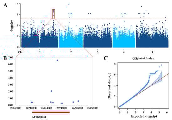In order to identify genetic mechanisms underlying the observed natural variation in SNS, GWAS was used to correlate phenotype and genotype using single nucleotide polymorphisms (SNP) data obtained from public databases [,]. GWAS were performed for each SNP using a linear mixed model and the results were analyzed using FaST-LMM []. Manhatten and Q-Q plots of GWAS result are illustrated in Figure 2A,C. A significance cutoff p-values < 4.7 × 10−6 (1/number of markers) detected totally 38 significant SNPs, which were mapped to specific chromosomal positions to screen for dozens of possible candidate genes (Table S2). According to gene expression data from the TAIR database [], we selected a plausible candidate gene among 38 SNP-trait associations, located besides the most significant GWAS signal in each local region and are highly expressed in flowers and pistils, for further verification (Figure 2B).