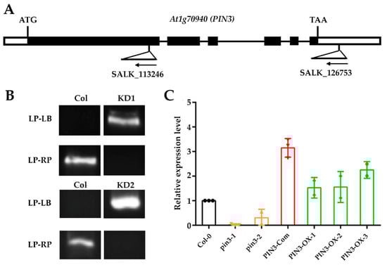 Identification of homozygous T-DNA insertion knockdown (KD) lines and PIN3 gene expression levels in the inflorescences of different lines. (A) Homozygous T-DNA insertion knockdown (KD) lines used in this study. The figure shows location of T-DNA insertion in the gene. The arrow indicates the direction of T-DNA insertion (reverse). (B) The left and right genomic primers LP and RP, and the T-DNA border primer LB used for validation of homozygous KD lines. The gel photo shows that the LP-LB primer pair was amplified, while the genomic primer pair LP-RP was not amplified, confirming that the KD mutants was homozygous. (C) qRT-PCR of PIN3 genes in pin3-1, pin3-2, PIN3-Com (complementation lines), PIN3-OX-1 (overexpression lines), PIN3-OX-2, and PIN3-OX-3 flowers.