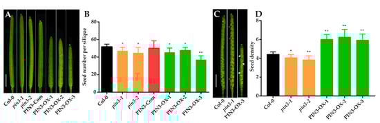 Because PIN3 is an auxin polar transporter, the ectopic overexpression of PIN3 might induce a constitutive response. To detect the specific regulation of PIN3 in SNS, we transformed Col-0 plants with a PIN3-GUS fusion construct driven by the placental-specific promoter STK. Interestingly, siliques in positive overexpression lines (PIN3-OX, Figure 3C) were shorter than those of Col-0 wild type (Figure 4C). Although PIN3 overexpression lines exhibited a reduction in the average SNS due to different degrees of abortion (Figure 4D), the overexpression of PIN3 significantly increased the SD in fully fertilized siliques. Even in siliques with aborted seeds, the SD ratio (of the total number of both aborted and fertile seeds to the length of silique) in PIN3 overexpression was higher than that of wild type (Figure 4C,D). Furthermore, although silique length was shortened because of unknown reasons, SNS was not decreased proportionally. Importantly, SD in these overexpression mutants increased significantly (Figure 4D).