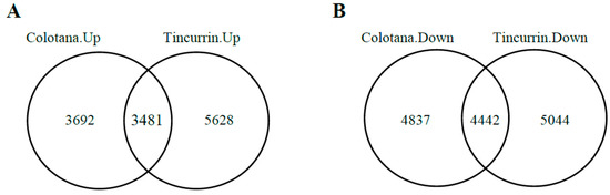 Venn diagram analysis of up- and downregulated genes (A) PEG-induced water-stress condition (Colotana.PEG) vs. Colotana under the control condition (Colotana.con) upregulated relative to PEG-induced water-stress condition (Tincurrin.PEG) vs. Tincurrin under control condition (Tincurrin.con) upregulated; (B) Colotana.PEG vs. Colotana.con downregulated relative to Tincurrin.PEG vs. Tincurrin.con downregulated.