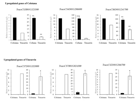 qRT-PCR validation of up- and downregulated DEGs in Colotana and Tincurrin. RNA-seq results (left) and qRT-PCR results (right) for six genes. Values are means ± SD of three biological replicates in qRT-PCR. The expression levels of each gene are expressed as relative to the mean value of the control samples. Student’s t-test was used to assess the significance of differences from control samples, * p < 0.05, ** p < 0.01, *** p < 0.001.