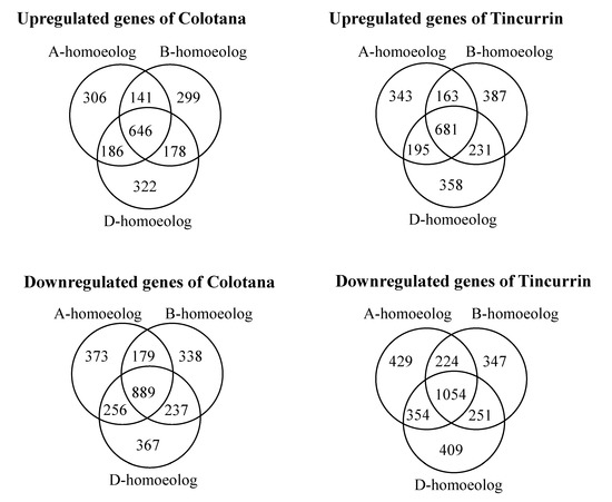 Classification of the differentially expressed genes in the A, B, and D subgenome after water stress in Colotana and Tincurrin genotypes. Venn diagram analysis showed relationship of the up- and downregulated homoeologous genes between the two genotypes.