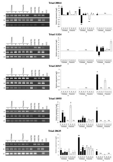 Comparison of differentially expressed A, B, and D homoeologous genes under abiotic stresses. Validation of expression divergence of homoeologous genes using qRT-PCR. PCR validation of qRT-PCR confirmed homoeologous genes using homoeolog-specific primers. The results of PCR experiments further confirmed the localization of homoeologous genes in their corresponding subgenomes. Student’s t-test was used to assess the significance of differences from control samples, * p < 0.05, ** p < 0.01. Each experiment was performed using Colotana and Tincurrin with three biological replicates. Chinese Spring (CS) was used as positive control, all reagents without template DNA as negative control (NTC). PEG-induced water stress: P; high-salinity stress: S; heat stress: H; cold stress: C; no data: ND; and no amplification: NA.