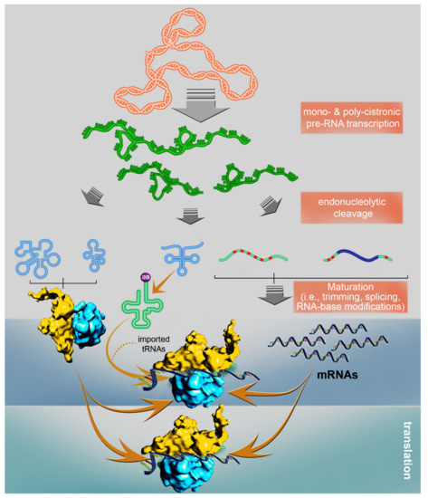 Among the many different eukaryotic organisms examined to date, land plants are found to contain the largest mitochondrial genomes. However, the size of the mtDNA is not the only characteristic that makes land plant mitochondria truly exceptional. The RNA metabolism characteristics of plant mitochondria (see Figure 1) are strikingly different from those of their prokaryotic ancestors and corresponding organelles found in Animalia. The mitochondria of flowering plants are, in particular, rich in introns (mostly group II-type), some of which are independently-transcribed as separate intron segments that are spliced in “trans” [94,95,96], and many of the primary mtRNAs must be modified by RNA editing in order to become functional transcripts, where these (and other) posttranscriptional processing events have the predominant role in determining gene product abundance [13]. The main processing steps of transcription, pre-RNA processing and translation in plant mitochondria are presented in Figure 1.