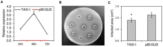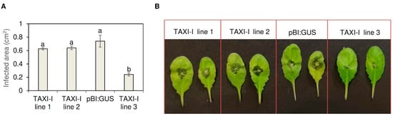 Basal Arabidopsis leaves of TAXI-I transgenic lines and pBI:GUS control plants were inoculated with agar disks colonized by actively growing B. cinerea mycelium, and the infected area was measured after 48 h from inoculation. Disease symptoms appeared as a leaf discoloration around the inoculation site; TAXI-I transgenic lines 1 and 2 showed an average infected area of 0.63 ± 0.02 cm2 and 0.64 ± 0.03 cm2, respectively, that are slightly but not significantly reduced in comparison to the area measured on pBI:GUS control plants (0.74 ± 0.09 cm2). Instead, the TAXI-I transgenic line 3 exhibited an average infected area of 0.24 ± 0.02 cm2, almost 70% lower compared to pBI:GUS plants (Figure 3A,B).