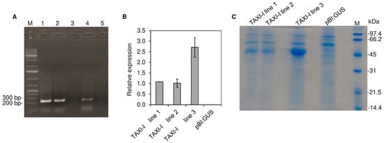 Seeds from Arabidopsis plants were transformed by a floral dip with an Agrobacterium tumefaciens strain containing the TAXI-I encoding gene and were selected by plating on Murashige and Skoog’s medium supplemented with kanamycin. A PCR performed with primers specific for the TAXI-I gene on DNA extracted from plants with antibiotic resistance confirmed the presence of the transgene and three TAXI-I transgenic lines (TAXI-I line 1, TAXI-I line 2 and TAXI-I line 3), phenotypically identical to wild-type plants, were selected for further analysis (Figure 2A).
