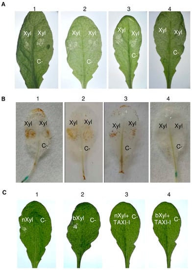 Analysis of necrosis and H2O2 production induced by BcXyn11a xylanase in Arabidopsis thaliana tissues and capacity of TAXI-I to limit the BcXyn11a effect in transgenic TAXI-I and wild-type A. thaliana (Col-0) leaves. (A) Necrotizing activity of BcXyn11a (Xyl) in infiltrated A. thaliana leaves of (1) pBI:GUS; (2) TAXI-I line 1; (3) TAXI-I line 2; (4) TAXI-I line 3 transgenic lines. (B) H2O2 induction by BcXyn11a xylanase in A. thaliana TAXI-I and pBI:GUS transgenic lines. Leaves were infiltrated with the BcXyn11a xylanase (Xyl) and treated with diaminobenzidine to reveal H2O2 accumulation. Samples: (1) pBI:GUS; (2) TAXI-I line 1; (3) TAXI-I line 2; (4) TAXI-I line 3. (C) Necrotizing activity of BcXyn11a assayed by droplet application method on wild-type Arabidopsis leaves using 70 ng of BcXyn11a (Xyl) alone or in combination with one µg of purified TAXI-I. Samples: (1) native BcXyn11a (nXyl); (2) boiled BcXyn11a (bXyl); (3) native BcXyn11a (nXyl) co-incubated with TAXI-I; (4) boiled BcXyn11a (bXyl) co-incubated with TAXI-I. In all experiments, acetate buffer 25 mM pH 5.2 (BcXyn11a buffer) was used as the negative control (C-). Xyl and C- indicates the infiltration and inoculation points. Pictures were taken three days after inoculation.