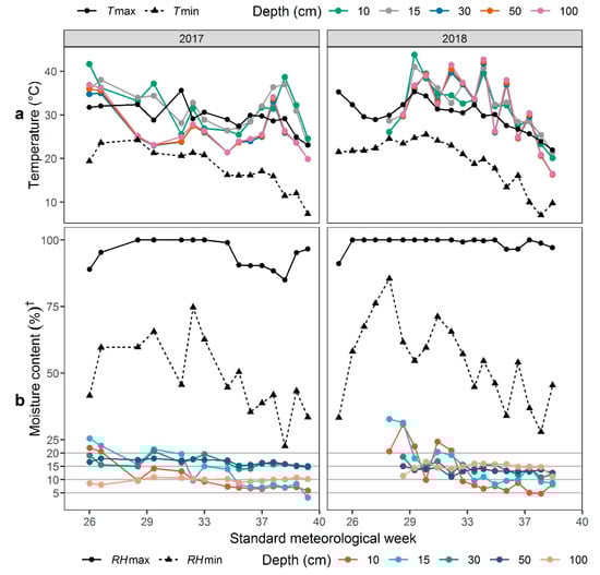 Meteorological and soil conditions at Shangzhuang Agricultural Research Station, Beijing, China from May to October for two consecutive trials in 2017 and 2018: (a) air minimum (Tmin) and maximum temperatures (Tmax; °C) at 2 m height from ground level together with soil temperatures (°C) at 10 cm, 15 cm, 30 cm, 50 cm, and 100 cm depths; (b) volumetric soil moisture content (%) at soil depths of 10 cm, 15 cm, 30 cm, 50 cm, and 100 cm accompanied by maximum and minimum relative humidity (%) of 2 m height from the ground. RHmax = maximum relative humidity, RHmin = minimum relative humidity. † While reading the y-axis of Figure 1b, the moisture content for RH is simply moisture content, whereas, for that of various soil depths, it is volumetric soil moisture content.