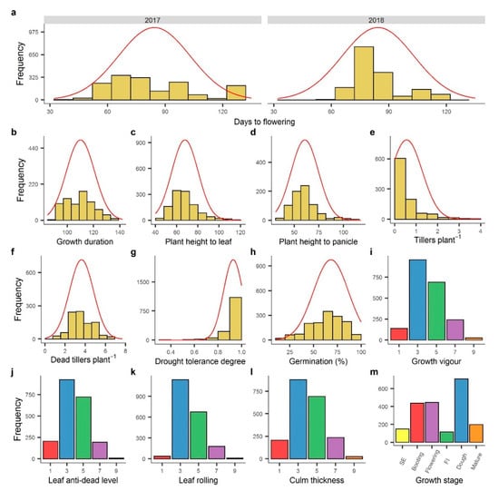 Frequency distribution of seven quantitatively measured and six visually scored traits: (a) days to flowering for 2017 and 2018; (b) growth duration (days); (c) plant height to leaf (cm); (d) plant height to panicle (cm); (e) tillers∙plant−1 (g); (f) dead tillers∙plant−1 (g); (g) drought tolerance degree; (h) germination (%); (i) growth vigor; (j) leaf anti-dead level; (k) leaf rolling; (l) culm thickness; (m) growth stage.
