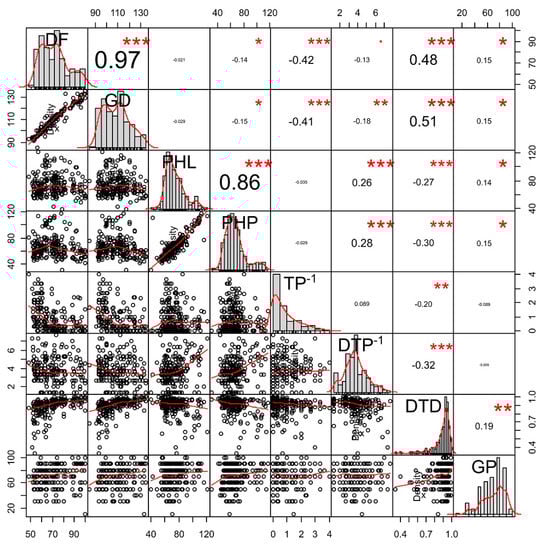 Relationship among days to flowering (DF), growth duration (GD; days), plant height to leaf (PHL; cm), plant height to panicle (PHP; cm), tillers∙plant−1 (TP−1), Dead tillers∙plant−1 (DTP−1), drought tolerance degree (DTD), and germination percentage (GP) under continuous drought stress. * p < 0.05, ** p < 0.01, *** p < 0.001.