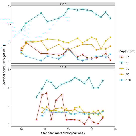 Electrical conductivity (EC) of soil at Shangzhuang Agricultural Research Station, Beijing, China from May to October for two consecutive trials in 2017 and 2018. Soil EC was recorded at 10 cm, 15 cm, 30 cm, 50 cm, and 100 cm.