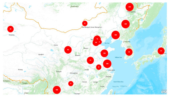 Geographic distribution of clusters among Japan, South Korea, and various regions of China.
