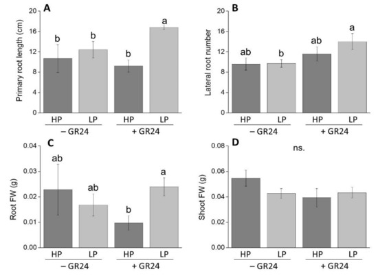 Main biometrics of two-week-old wild-type (WT) seedlings grown either in a standard MS (high P, HP) or in Pi-deprived conditions (low P, LP), with (+ GR24) or without (− GR24) 5 µM rac-GR24: (A) primary root length; (B) number of lateral roots; (C) root fresh biomass; (D) shoot fresh biomass. Each column represents the average of three (C,D) to six seedlings (A,B) with standard error. Statistical significance of differences between means is indicated by different letters above bars (p ≤ 0.05).