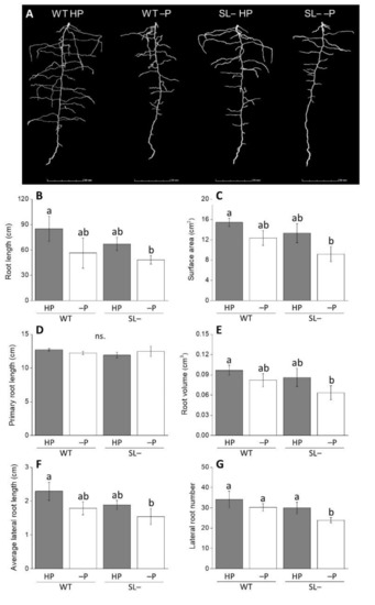 (A) Image of root architecture displayed by X-ray CT; (B–G) Root growth-associated parameters of wild-type (WT) and strigolactone-depleted plants (SL–) grown for 10 days inside columns filled with quartz sand and daily watered with modified Hoagland solution containing either high P (HP) or no P (–P). Data represent the means of measurements on 3 independent replicates per genotype and condition (± SE) obtained via X-ray CT. Different letters above bars indicate significant differences between treatments (p ≤ 0.05).