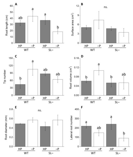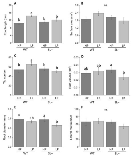Root growth-associated parameters of wild-type (WT) and strigolactone-depleted plants (SL–) grown for 10 days in MS medium with either high P (HP) or low P (LP). (A) Root length; (B) surface area; (C) tip number; (D) root volume; (E) root diameter; (F) lateral root number. Data represent the means of 14 measurements per treatment (± SE) obtained via WinRHIZO. Different letters above bars indicate significant differences between treatments (p ≤ 0.05).