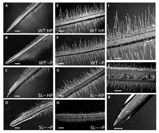 Root tip morphology of wild-type (WT) and strigolactone-depleted plants (SL–) grown for 10 days in MS medium with either high P or low P and further transferred for one week to MS medium containing either high P (HP) or no P (–P), respectively. (A–D) Root primary morphology, differentiation zone and tip of plants: (A) WT under HP (B) WT under –P (C) SL– under HP (D) SL– under –P. (E–H) zoom-in on the root differentiation zone of plants: (E) WT under HP (F) WT under –P (G) SL– under HP (H) SL– under –P. (I) Higher magnification of WT HP differentiated root primary structure; (K) Higher magnification of SL– –P differentiated root primary structure; (K) Higher magnification of SL–HP root tip. Scale bars: 200 µm (A–H); 1 mm (I–K).