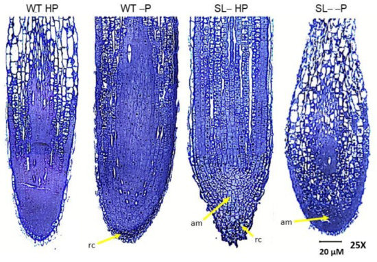 Light micrographs of longitudinally sectioned root tips of wild-type (WT) and strigolactone-depleted plants (SL–) grown for 10 days in MS medium with either high P or low P and further transferred for one week to MS medium containing either high P (HP) or no P (–P), respectively. In WT HP plants, the postmitotic isodiametric growth zone is reduced in length compared to WT –P plants, and the cells acquire an elongated shape closer to the apical meristem (am). In WT –P plants, an extended postmitotic isodiametric growth, with cells maintaining their isodiametric shape, is visible throughout the root tip. Note the wider root tip diameter compared to WT HP plants. In SL– HP plants, note the root cap (rc) with cells enclosing several small vacuoles, the cone shape of the root apex, and the maintenance of cells with meristematic features along the root longitudinal axis. Above the apical meristem are many cells with isodiametric shape and several vacuoles scattered in the cytoplasm. The root tip of SL– –P plants is swollen and displays high levels of disorganization. A small apical meristem is visible in the center. Above it, most cells are elongated, with a large central vacuole. Below it, cells are isodiametric with several small vacuoles.